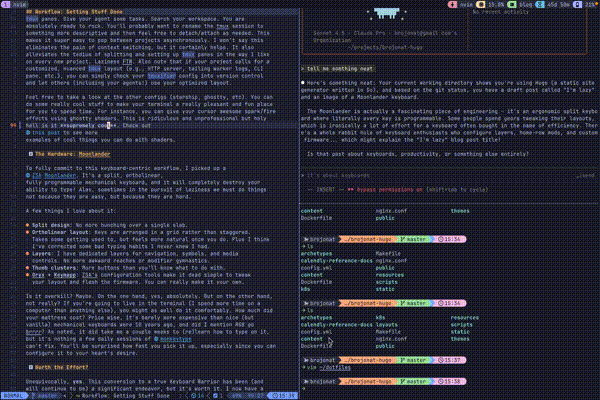 See, the thing you have to realize is that I’m just so fucking lazy. But “lazy good”, not “lazy bad”. In other words, I can’t be fuxked to have to remember how to configure my shell, multiplexer, editor, etc. every time I context switch, let alone setup a new machine. Instead, I’ve cobbled together a bunch of configs and terminal based tools so that I can bootstrap a new fully fledged AI equipped development environment on any system while expending as little time and effort as possible. That’s what real laziness looks like and what this post is really about: rejecting complacency and doing a ton of work so you can do less work so you can do more work! Confused? Great, keep reading.